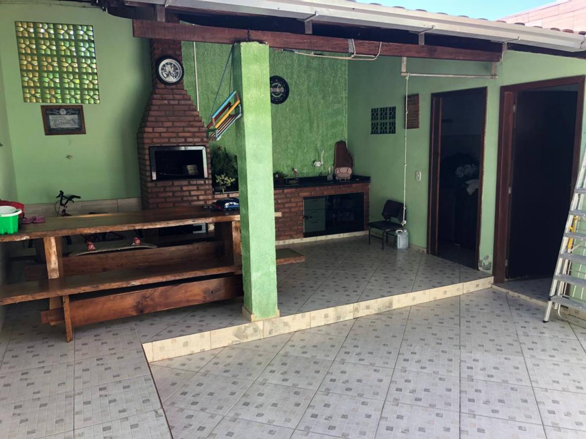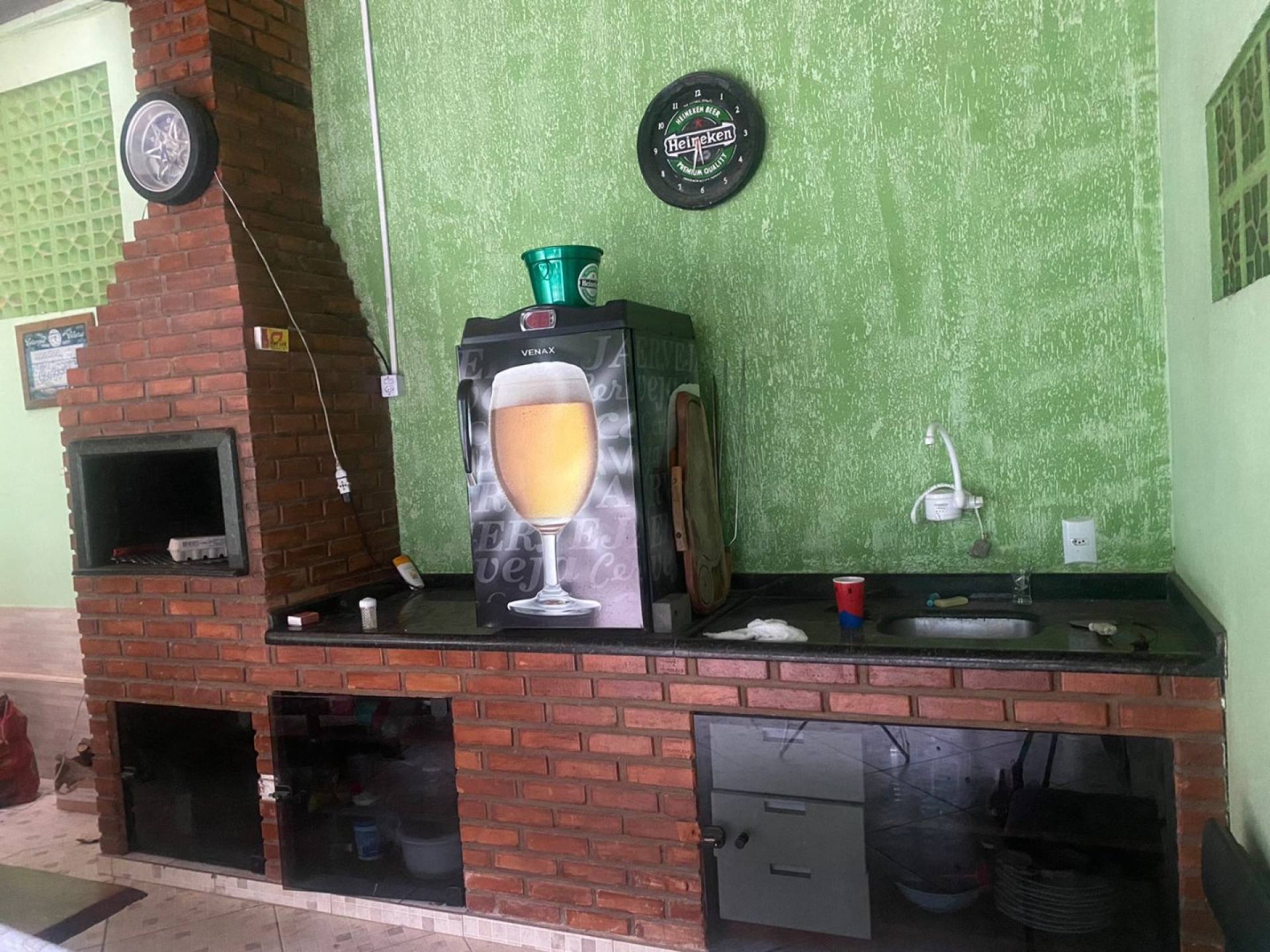 Área de festa com churrasqueira a carvão, banheiro e lavação fechada